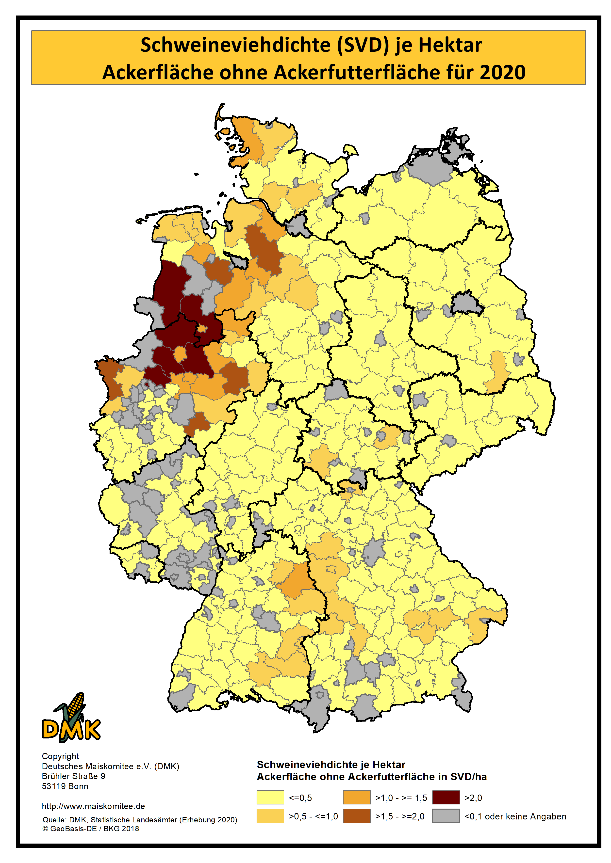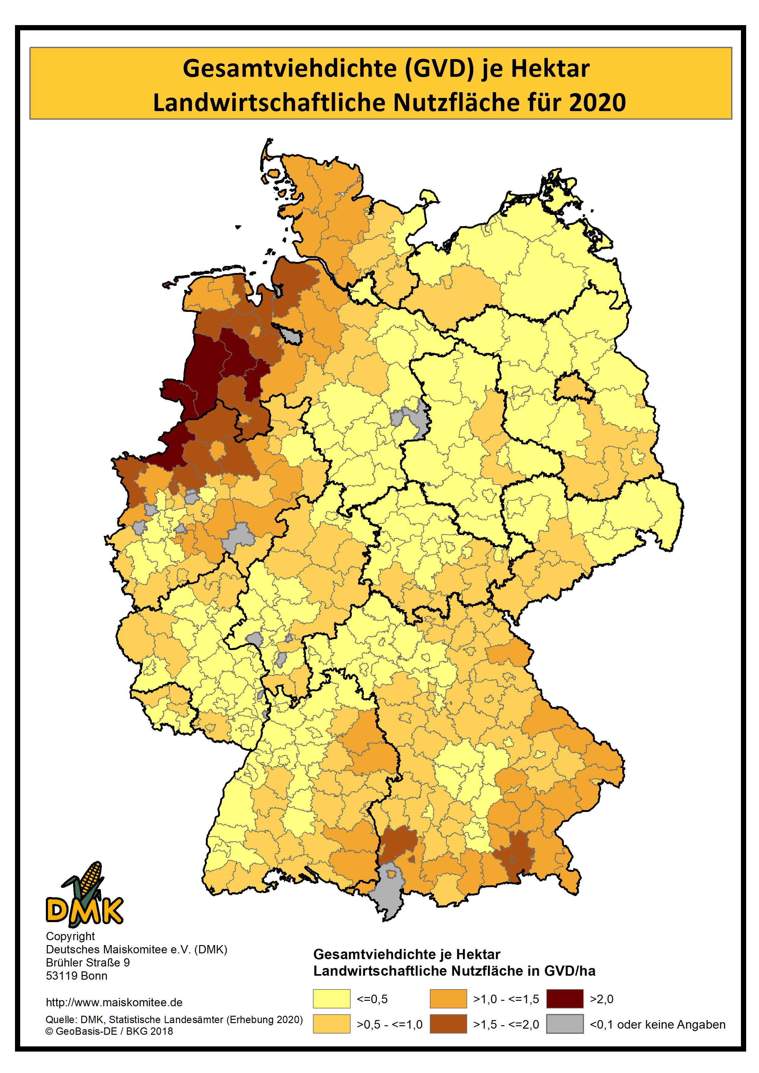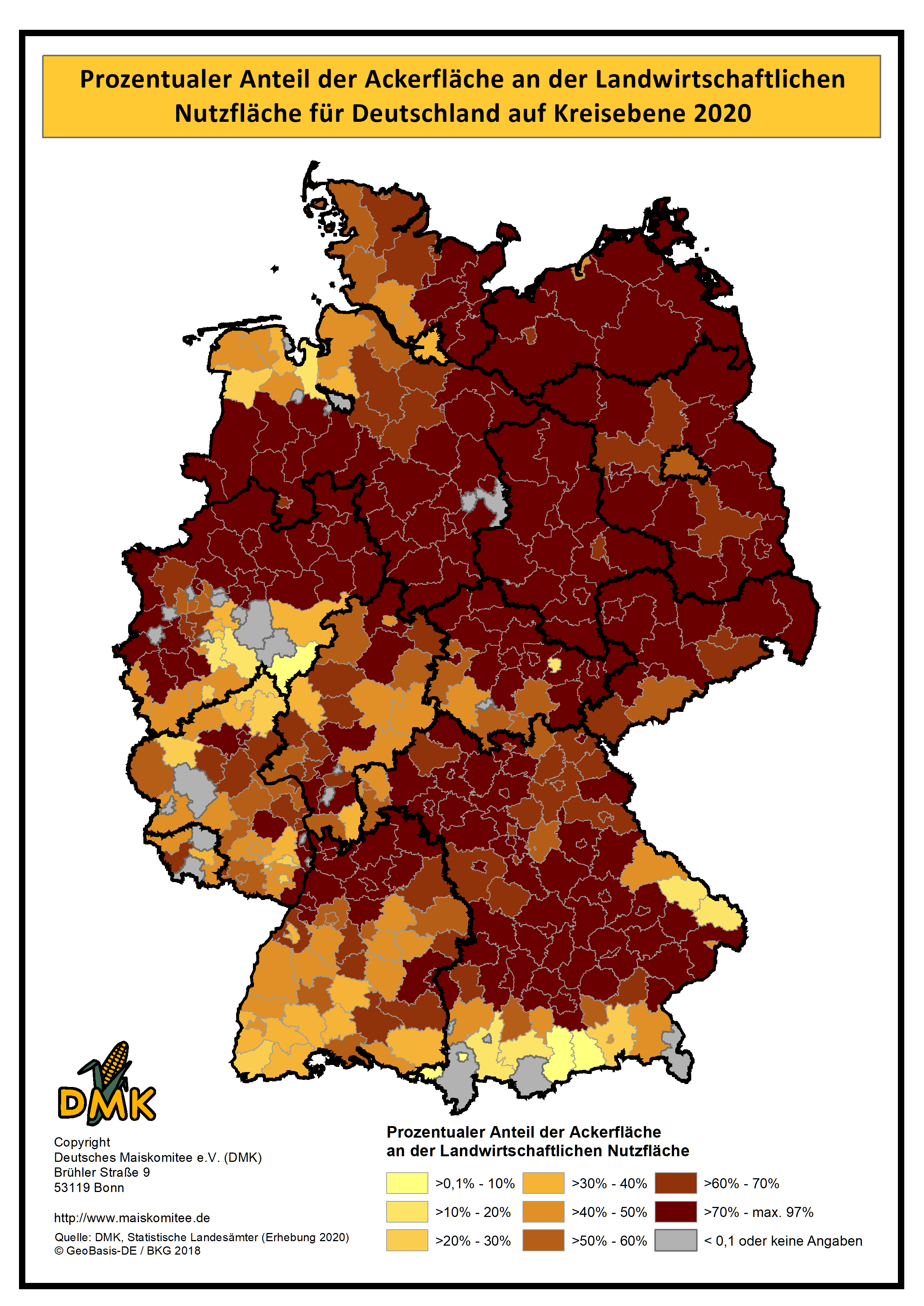 Auf dieser Seite haben wir die statistischen Daten zum Maisanbau, auf Kreisebene, in Karten projiziert. Die Daten basieren auf der Landwirtschaftszählung, die 2020 durch die Statistischen Ämter des Bundes und der Länder durchgeführt wurde. Die nächste Landwirtschaftszählung wird voraussichtlich 2030 erfolgen.
